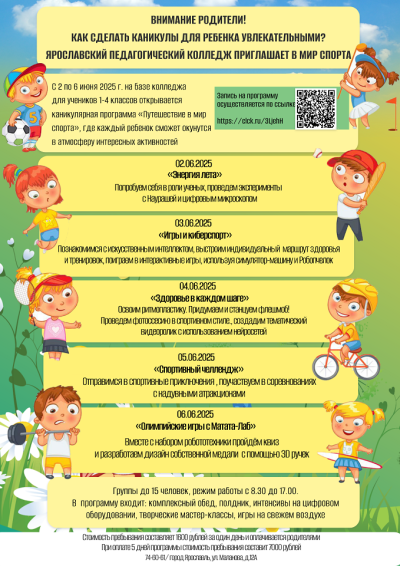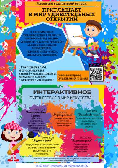 ГПОАУ ЯО Ярославский педагогический колледж в период с 18.11.2024 г. по 22.11.2024 г. приглашает обучающихся 1-4 классов на увлекательную программу организации досуга в каникулярное время «Мир удивительных открытий». В программу входит: пребывание детей с 8.30 до 17.00; комплексный обед, полдник; знакомство с цифровым и интерактивным оборудованием – умный пол, Smart-доска, робототехнические наборы, цифровые лаборатории, а также, участие в квестах, творческих мастер-классах, различных играх. |